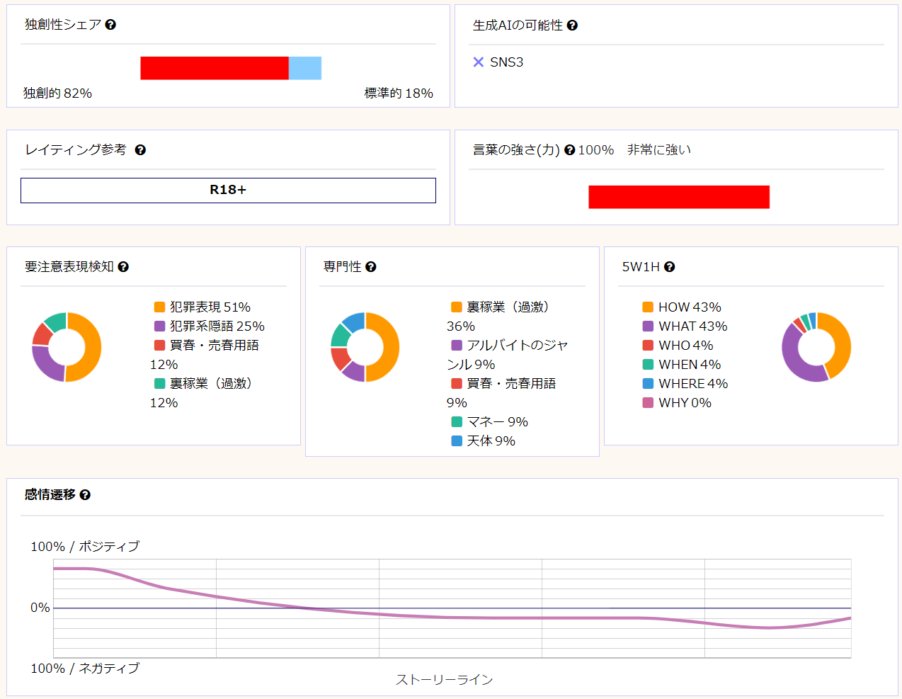 センシティブ判定は「個人情報」「誹謗中傷」「闇バイト」「人種・性差別」「薬物、出会い系隠語」「ポリティカルコレクトネス(ポリコレ)」など、NGワードやネガティブと判定された文章を検知。WEBサービスまたはAPI形式で返却します